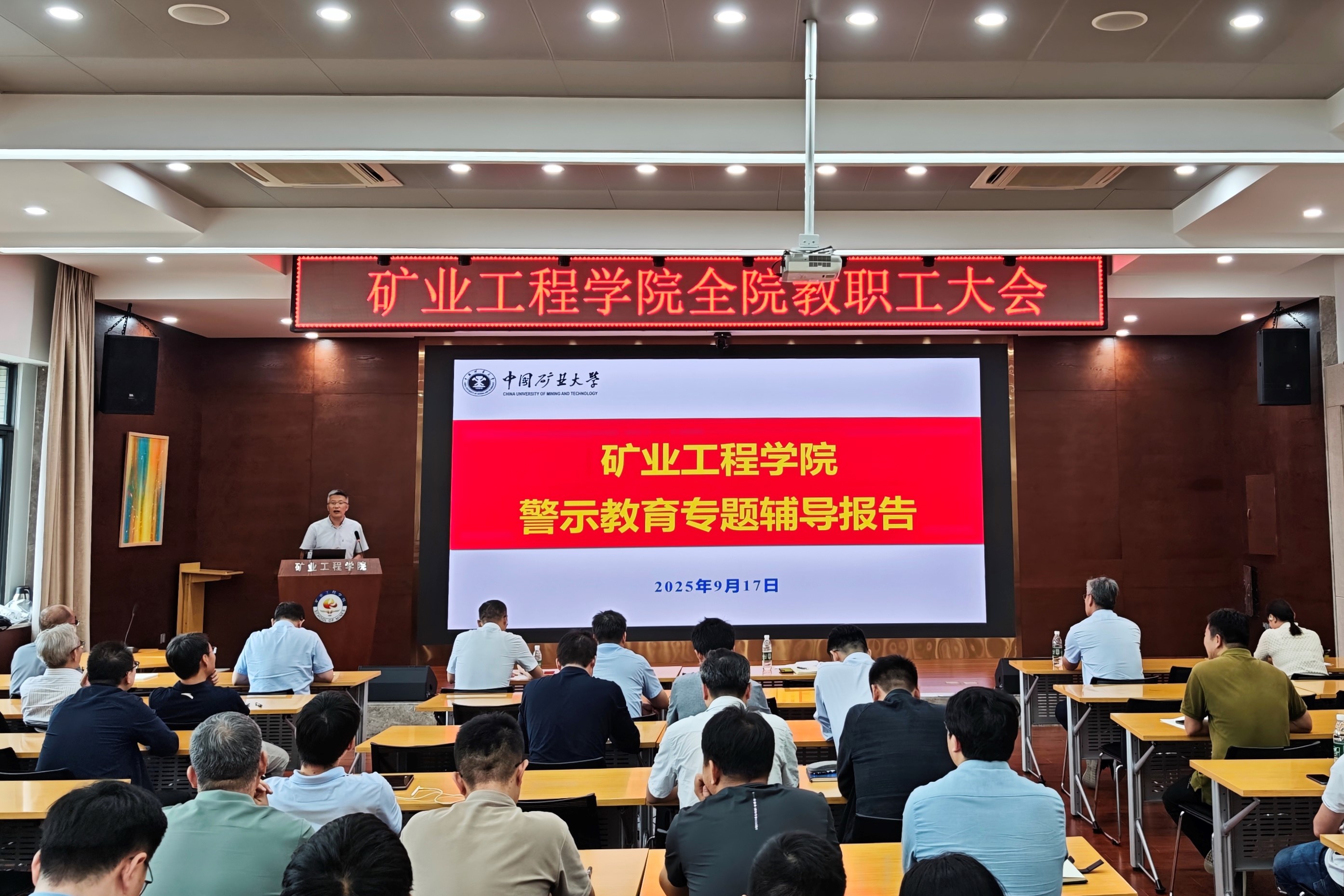 9月17日下午,矿业工程学院在矿业楼A604报告厅召开全体教职工大会,学院领导班子和全体教职工参加。会议邀请了校纪委办公室主任、监察处处长刘国栋,人力资源部部长桂夏辉作专题辅导报告。会议由学院党委书记王思华主持。